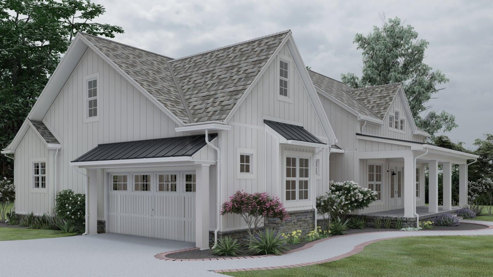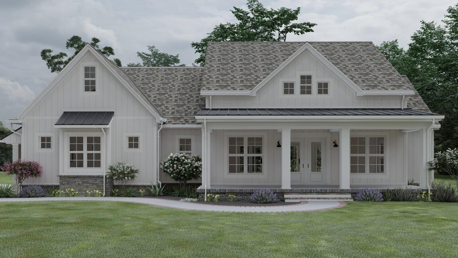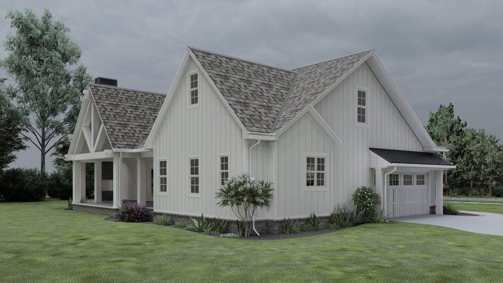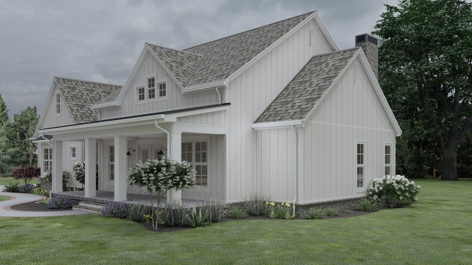 This Modern Farmhouse outlines an approximate 2,031 square-foot home with vaulted ceilings and two spacious covered porches upheld by wide, white columns. The exterior is designed with board and batten siding and a generous amount of windows throughout all sides of the home. The two-car garage details a side entry with a bump-out section for a bit of storage space and an optional third bay. The rear porch delivers excellent space for year-round entertainment with a vaulted ceiling and an optional fireplace.