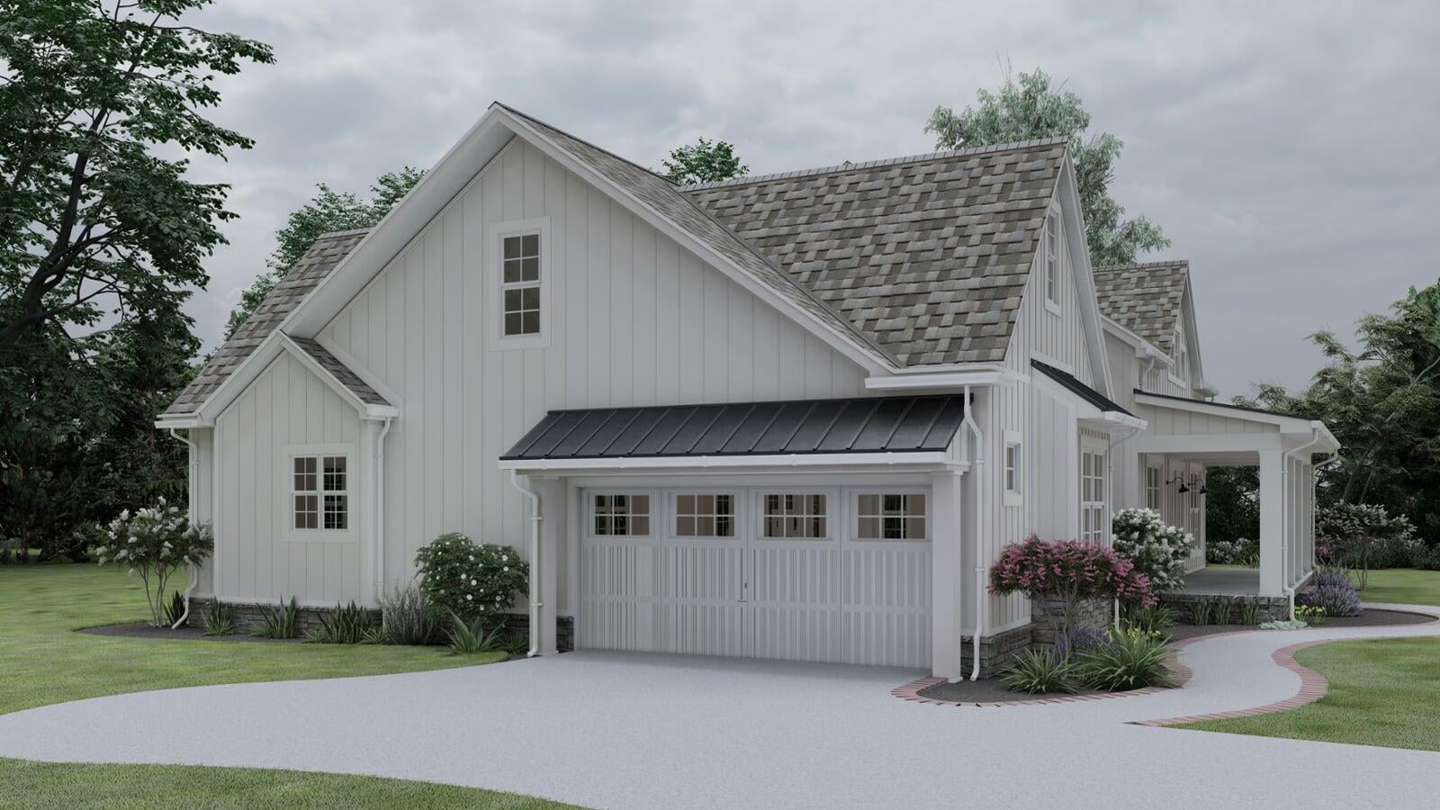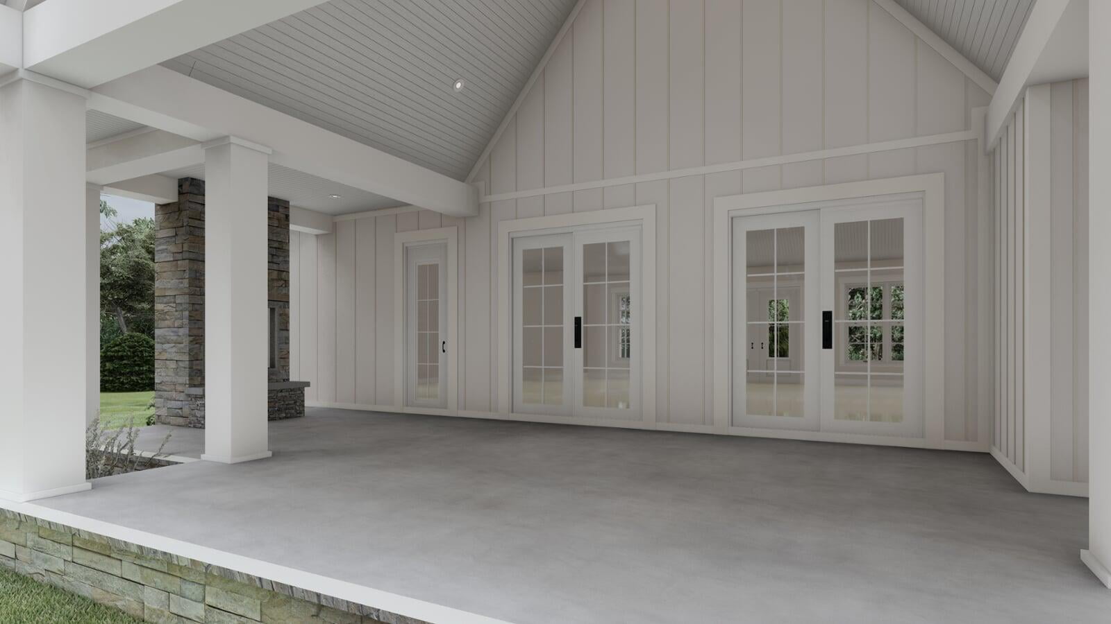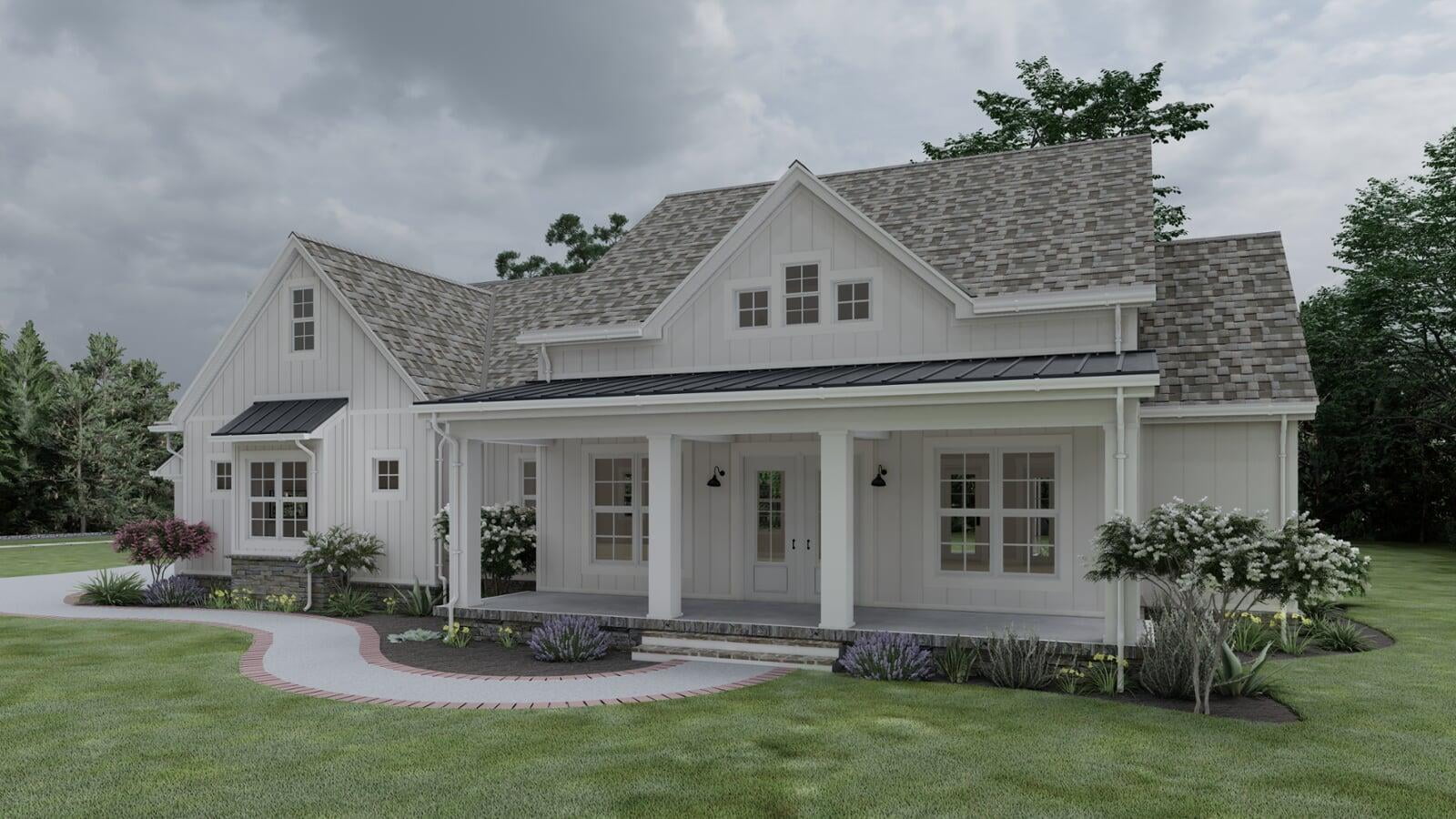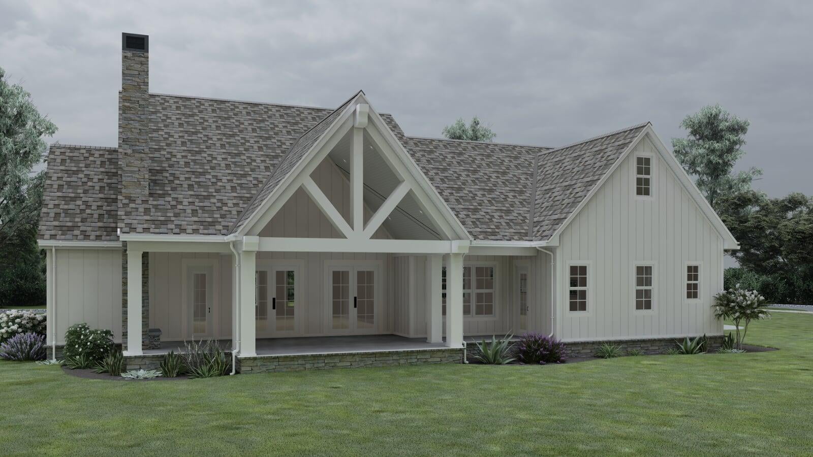 This Modern Farmhouse outlines an approximate 2,031 square-foot home with vaulted ceilings and two spacious covered porches upheld by wide, white columns. The exterior is designed with board and batten siding and a generous amount of windows throughout all sides of the home. The two-car garage details a side entry with a bump-out section for a bit of storage space and an optional third bay. The rear porch delivers excellent space for year-round entertainment with a vaulted ceiling and an optional fireplace.
